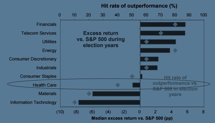 - ถึงแม้โอกาสที่เจ๊ Clinton จะได้รับเลือก และดันกม. จะมีไม่มาก แต่จากสถิติย้อนหลังในปีที่มีการเลือกตั้ง 10 ครั้งในอดีตที่ผ่านมา (ตั้งแต่ปี 1972 ถึง 2012) พบว่า กลุ่ม Healthcare ทำผลตอบแทนได้ไม่ดี คือ มีโอกาสแพ้ดัชนี S&P500 ถึง 60% ทีเดียว ไม่เหมือนกลุ่ม Financials และ Telecom Services ที่ผลตอบแทนโดดเด่นในช่วงปีที่มีการเลือกตั้ง ดังนั้น ต้องระวังการทำ Sector Rotation (ย้ายเงินจากกลุ่มอุตสาหกรรมหนึ่ง ไปอีกกลุ่มหนึ่ง) นะครับ