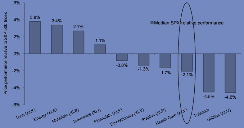 - ในช่วงที่สหรัฐฯกำลังจะขึ้นดอกเบี้ยแบบช่วงนี้ สถิติย้อนหลัง นับจากวันที่สหรัฐฯขึ้นดอกเบี้ยไป 6 เดือน พบว่า กลุ่ม Heathcare ก็แพ้ S&P500 เช่นเดียวกัน
