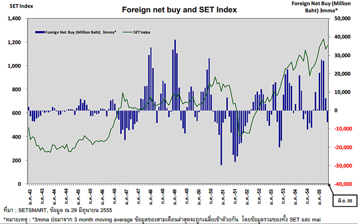 ว่าแล้ว เราก็สังเกตุเห็นว่า หลายครั้งที่นักลงทุนต่างชาติซื้อสุทธิในตลาดหุ้น หุ้นก็มักจะขึ้นตาม และเมื่อไหร่ที่ตลาดโดยเทขายด้วยนักลงทุนกลุ่มนี้ หุ้นก็มักจะลงตาม ซึ่งเมื่อดูจากสถิติในระยะยาว เราก็พบว่า มันเป็นอย่างที่เราคิดจริงๆด้วย ลองดูข้อมูลสถิติย้อนหลังตั้งแต่ปี 43 จะเห็นว่า เมื่อไหร่ที่นักลงทุนต่างชาติซื้อ หุ้นก็วิ่งขึ้นจริงๆ และเมื่อเขาขาย หุ้นเราก็ดิ่งลงตามแรงโน้มถ่วง ดังนั้น เราจึงเห็นนักลงทุนหลายกลุ่ม ที่ให้ความสำคัญกับการซื้อ/ขายสุทธิของนักลงทุนต่างชาติเป็นอันดับต้นๆ