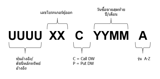 ตัวอย่างเช่น ITD28C1509A ที่เราพูดถึงไปก่อนหน้านี้ หมายถึง DW ที่อ้างอิงหุ้น ITD ออกโดย โบรกเกอร์เบอร์ 28 (เบอร์ 28 หมายถึง บล.แมคควอรี) ประเภทสิทธิในการซื้อ (Call DW) ซื้อขายวันสุดท้ายในเดือนกันยายน ปี2558 (1509) รุ่น A