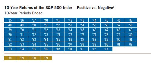 หัวใจสำคัญที่จะทำให้เรารอดพ้นจากความผันผวนของตลาดในระยะสั้น ก็คือ ตั้งเป้าหมายการลงทุนในระยะยาว ซึ่งผลสรุปในระยะยาว ก็ออกมาค่อนข้างชัดเจน จากการศึกษาย้อนหลังไป 79 ปีในดัชนี S&P500 โดยการตั้งสมมติฐานว่า ลงทุนระยะยาวใช้เวลา 10 ปี นับตั้งแต่ปี 1925 เรื่อยมา พบว่า หากนักลงทุนสามารถยิดการลงทุนได้ยาว 10 ปี จะมีโอกาสกำไรสูงถึง 95% หรือ 75 ปี จากทั้งหมด 79 ปี โดยยอดการลงทุนที่ขาดทุน เป็นสามาเหตุมาจากการไปขายทิ้งในช่วงที่ตลาดเกิดฟองสบู่ทั้งหมด 4 ครั้งพอดี คือปี 1938, 1939, 2008 และปี 2009 ซึ่งหากนักลงทุนถือต่ออีกอย่างน้อย 3 ปี การลงทุนจะกลับมาให้ผลตอบแทนเป็นบวกทันที