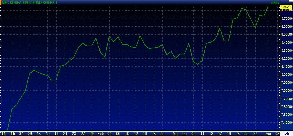 เรียกว่าเฉือนอันดับสองแค่ปลายจมูกจริงๆ กองทุนนี้เป็นของ บลจ. MFC ถือเป็นกองทุนประเภท Trigger Fund ที่ลงทุนในหุ้นในประเทศเกาหลีใต้ โดยไม่อ้างอิงดัชนีตัวใด เรียกว่าไปหาหุ้นด้วยตัวเองว่างั้นเถอะ โดยใช้ Benchmark ก็คือ Korea Composite …แต่ช้าก่อนครับ กองทุนนี้จัดตั้งขึ้นตั้งแต่เดือน ต.ค. ปี 2555 และจริงๆ กำหนดอายุกองทุนแค่ 8 เดือนครับ … แต่นี่ผ่านมา 2ปีกว่า กองทุนก็ยังเปิดอยู่ นั้นแสดงว่า “ไม่สามารถไปถึงเป้าที่ตั้งไว้ 10% ได้ แย่กว่านั้นคือ ตลาดหุ้น KOSPI ร่วงรูดกราวเพราะการอ่อนค่าของค่าเงินเยน ทำให้สินค้าญี่ปุ่นซึ่งเป็นคู่แข่งสินค้าเกาหลี ดูถูกลงในสายตาของลูกค้าทันที แล้วลองถามตัวเองสิครับ ถ้าสินค้าประเภทเดียวกัน ราคาเท่ากัน คุณจะเลือก Made in Korea หรือ Made in Japan แน่นอนว่า หุ้นส่งออกของเกาหลีจึงมีปัญหาในช่วงที่ญี่ปุ่นออกมาตรการ Abenomics ออกมา ส่วนการวิ่งได้แรงในช่วง 3 เดือนแรกของปีนี้ ก็มาจากความหวังเรื่องเงินทุนไหลออกที่หยุดลง และค่าเงินวอนเริ่มคงที่ ประกอบกับคู้ค้ารายใหญ่อย่างจีน กำลังจะมีมาตรการกระตุ้นเศรษฐกิจออกมาอีก สิ่งเหล่านี้เลยทำให้ตลาดหุ้นเกาหลีวิ่งดีอย่างที่เราเห็น