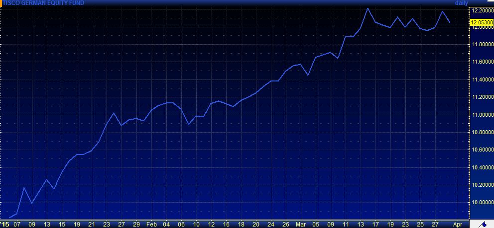 กองทุน TISCOGY ถือเป็น Passive Management Portfolio เน้นให้ผลการดำเนินล้อตามดัชนีชี้วัด ซึ่งก็คือ ดัชนี DAX ซึ่งเป็นตลาดหุ้นเยอรมัน ด้วยการไปลงทุนในกองแม่ที่ชื่อว่า db x-trackers DAX UCITS ซึ่งเป็น ETF Fund ผลตอบแทนที่สูงของกองนี้ มาจาก Macro View เช่นเดียวกับกองทุน KF-HEUROPE ของ บลจ.กรุงศรี แต่ที่เฉียนกันหลักทศนิยม นั้นเป็นเพราะว่า ตลาดหุ้นเยอรมัน ได้รับประโยชน์จากการอ่อนค่าของเงิน EUR มากกว่า เพราะธุรกิจในเยอรมันพึ่งพาการส่งออกในสัดส่วนที่สูง ซึ่งต่างจากกองทุน KF-HEUROPE ที่กองทุนหลักกระจายความเสี่ยงลงทุนในหลายประเทศกว่า ใครมองว่า การมี QE ของยุโรป จะยังทำให้ภาพรวมการลงทุนในภูมิภาคนี้น่าสนใจตลอดทั้งปี นี้ก็เป็นอีกหนึ่งตัวเลือกที่ไม่เลวครับ