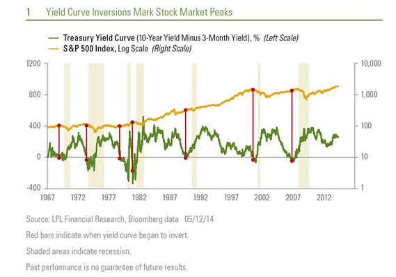 ในที่นี้ ขอยกตัวอย่างพันธบัตรสหรัฐก็แล้วกันนะครับ โดยปกตินักเศรษฐศาสตร์ เขาจะใช้ อัตราผลตอบแทนของพันธบัตรอายุ 10 ปี ลบด้วย พันธบัตรที่อายุ 3 เดือน แล้วดูส่วนต่าง ซึ่งนักลงทุนเราจะเรียกกันว่า Yield Spread วิธีดูก็คือ ถ้า Yield Spread มันแคบมากๆ แบบในรอบ 5-7 ปี ที่ผ่านมา ช่วงที่เราดูเป็นช่วงที่แคบที่สุด แบบนั้น แสดงว่า ตลาดหุ้น กำลังเข้าสู่จุดสูงสุด เตรียมกลับทิศทางแล้ว และในทางตรงกันข้าม ถ้า Spread มันกว้างมากๆเมื่อไหร่ ให้ระลึกไว้เลยว่า ได้เวลา Shopping เพราะตลาดหุ้นกำลังจะวิ่งขึ้นแล้วแน่ๆ