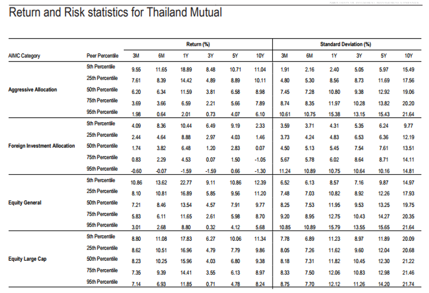 ปัจจัยเชิงปริมาณ : คือ ข้อมูลที่สามารถแปลเป็นตัวเลขได้ ซึ่งตัวสำคัญเลยก็คือ ผลตอบแทนย้อนหลังระยะยาว 3 ปี 5 ปี (ยิ่งไกลไปถึง 10 ปี ยิ่งดี) เพราะสะท้อนความสามารถของผู้จัดการกองทุนได้ดี แต่ไม่ใช่แค่นั้น ผมแนะนำให้ดูความผันผวน หรือ Standard Deviation ประกอบด้วย ซึ่งทางสมาคิมบริษัทหลักทรัพย์จัดการกองทุน ก็ได้มีการจัดทำ AIMC Category Performance Report เป็นรายเดือน ไว้เป็น Guideline ให้กับนักลงทุนได้ใช้เช่นกัน เพื่อเปรียบเทียบว่า ทั้งผลตอบแทน และความผันผวน ของกองทุนที่เราเลือกเนี่ย เทียบกับกองทุนอื่นๆแล้ว ถือว่าดีกว่า หรือแย่กว่าอย่างไร