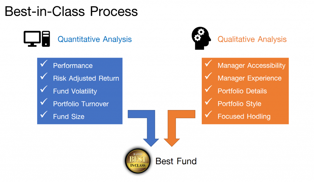 กระบวนการคัดเลือกกองทุนที่เรียกว่า Best-In-Class Process หรือ การคัดเลือกกองทุนคุณภาพดีเยี่ยมมาเข้าพอร์ต ซึ่งจะดูทั้งปัจจัยเชิงคุณภาพ และปัจจัยเชิงปริมาณ