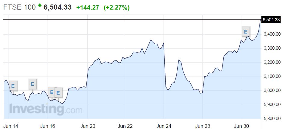 ✍ ไปดูดัชนี FTSE100 ของอังกฤษ ตัวต้นเหตุให้ตลาดตกใจ กลับกลายเป็น ลงเบาตลาดอื่นในยูโรโซน และล่าสุด เมื่อคืนบวกอีก +2.2% ยืนเหนือ 6,500 จุด ซึ่งสูงกว่าก่อนประกาศผลประชามติเสียอีก และถือว่าแข็งแกร่งที่สุดในบรรดาตลาดพัฒนาแล้ว (Developed Markets)