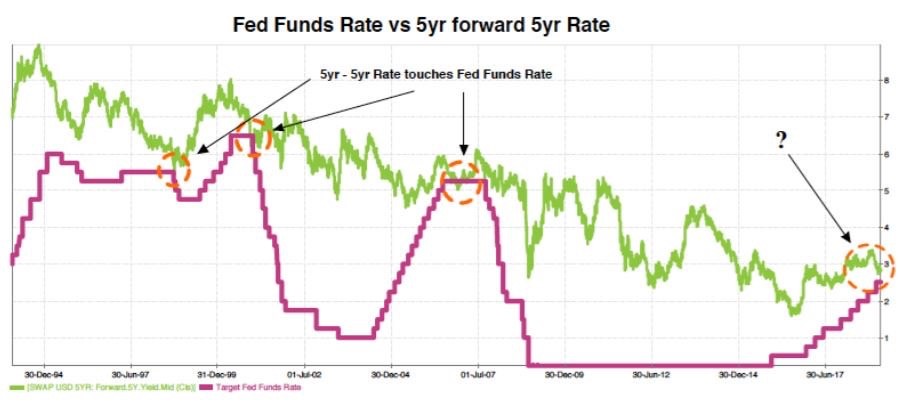 จากตารางจะเห็นว่า เมื่อ Fed Fund Rate ขึ้นมาเท่ากับ 5-year/5-year swap rate เราพบว่า ดอกเบี้ยหยุดขึ้น และมีโอกาสปรับตัวลดลงหลังจากนั้นภายในไม่เกิน 2 ปีข้างหน้า