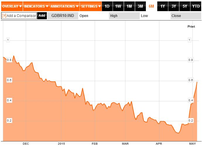 ประเด็นที่มันเริ่มน่ากลัว ก็ตรงนี้ครับ QE ของยูโรโซน ทำให้เกิดการทำ Euro Carry Trade กู้เงินยูโร ไปลงทุนในสินทรัพย์เสี่ยงทั่วโลก ผมเชื่อว่า น่าจะมีกลุ่มนักลงทุนบางกลุ่มที่กู้ระยะสั้น แล้วเอามาลงทุนในพันธบัตรระยะยาว เพราะคิดว่าความเสี่ยงไม่มี ยังไง QE ก็หนุนหลัง แต่ปรากฏว่า ปลายเดือน เม.ย. Bond Yield ของเยอรมันกลับดีดขึ้นมารุนแรงทีเดียว ตามกราฟด้านล่าง
