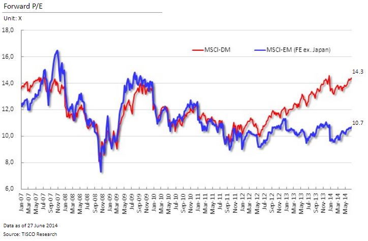 PE ตลาดหุ้นพัฒนาแล้วได้กลับเข้าสู่ระดับก่อนเกิดวิกฤต ขณะที่ ตลาดหุ้นกำลังพัฒนา ยังมีมูลค่าถูกกว่าพอสมควร