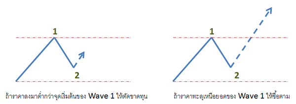 ขั้นแรกก็ดูก่อนว่า ขาลงที่เราเห็น (รูปแรก) ลงมาต่ำกว่าจุดเริ่มต้นของคลื่นลุกที่ 1 หรือเปล่า (เส้นประสีแดง) หากไม่ต่ำกว่า และมีการดีดตัวขึ้นไป ให้เตรียมเงินไว้ทันที