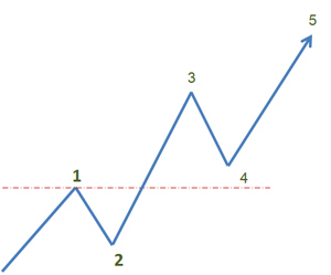 ขั้นที่สอง หากราคาหุ้นหรือดัชนีสามารถทะลุผ่านจุดสูงสุดของคลื่นลูกก่อนหน้านี้ได้ (รูปที่สอง) หน้าที่ของนักลงทุนก็คือ “ซื้อตาม” (Follow Buy) นั้นเอง เพราะมีโอกาสสูงมากที่คลื่นลูกนี้จะเป็น Wave 3 ซึ่งเมื่อรวมกับกฏที่ว่า “Wave 3 ต้องไม่สั้นที่สุด” นั้นก็หมายความว่า กำไรจากการเข้าซื้อลงทุนตรงจุดนี้ มีสูงมากนั้นเองครั้บ