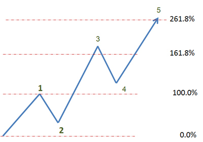 แต่หากราคาหุ้นสามารถทะลุผ่านจุดสุงสุดเดิมได้ ทำ Higher High (เหมือนตัวอย่างการเข้าสู่ Wave 3 ในช่วงต้นของบทความ) ราคาเป้าหมาย ก็คือ 161.8% 261.8% หรือหากเป็นคลื่นที่แรงจริงๆ ก็สามารถวิ่งขึ้นได้ถึง 423.6% ทีเดียว