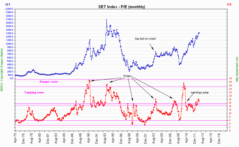 ลองดูกราฟ P/E SET Index ย้อนหลังไกลๆ เทียบกับดัชนีราคาหุ้นนะครับ