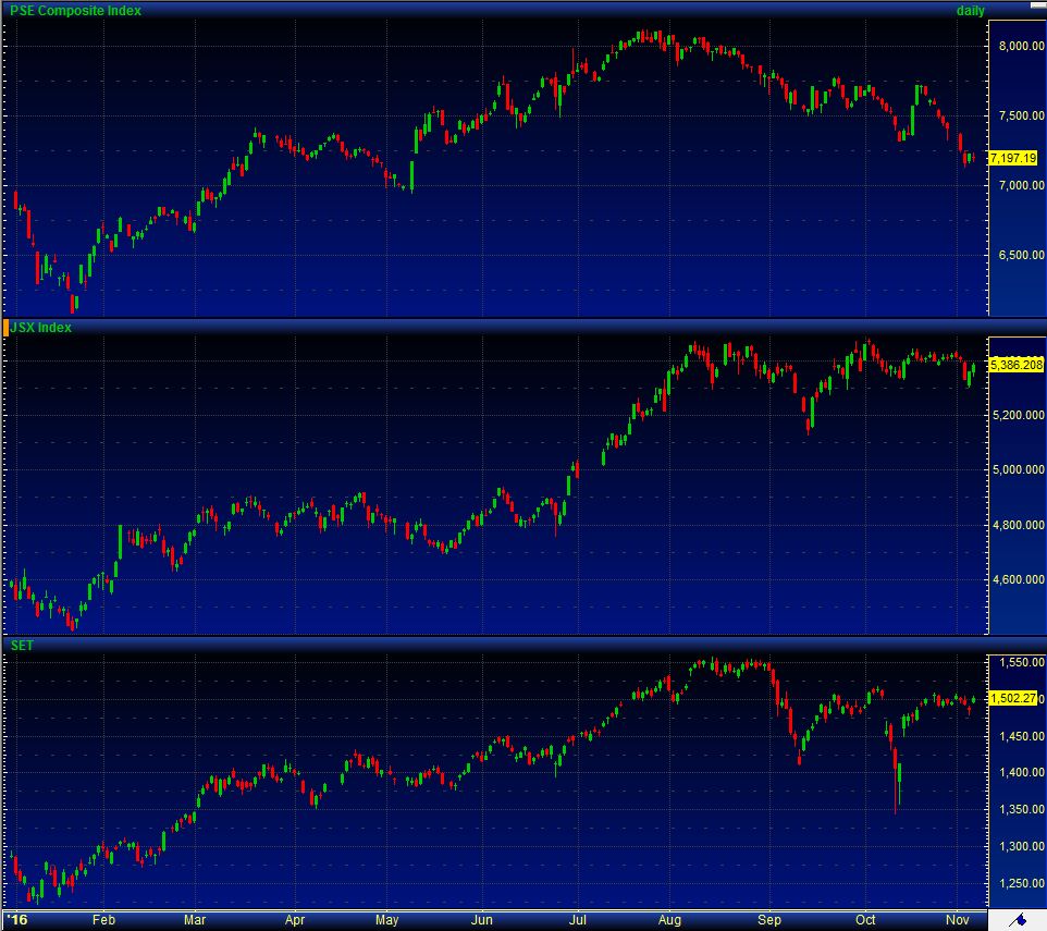 ตลาดหุ้นทั้ง 3 ตลาด ทำจุดสูงสุดของปีนี้ในช่วงเดือน ก.ค. – ส.ค. และมีการปรับฐานตามมาหลังจากนั้น กลางเดือน ต.ค. ตลาดหุ้นไทยปรับฐานหนัก อีก 2 ตลาด ก็ปรับฐานตามเราด้วยแต่ไม่มากเท่า แต่หากดูจนถึงตอนนี้ จะเห็นว่า ดัชนี PSE Composite ของฟิลิปปินส์นั้นเคลื่อนไหว Underperform อีก 2 ตลาดพอสมควร ซึ่งก็เป็นช่วงที่ความสัมพันธ์ของเขากับสหรัฐฯเปราะบาง จนใกล้จะถึงจุดวิกฤตอย่างที่ไม่เคยมีมากก่อน