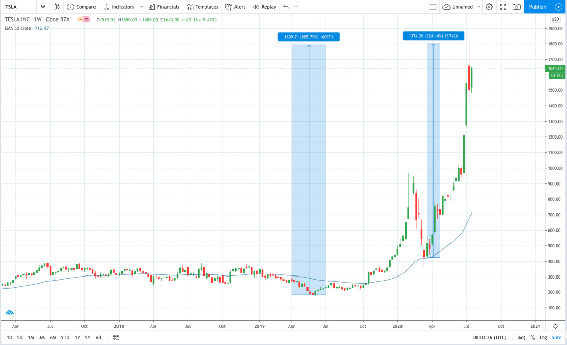 ภาพแสดง Moonshot ราคาหุ้นของ Tesla ที่มา: Tradingview วันที่ 21 กรกฎาคม 2020