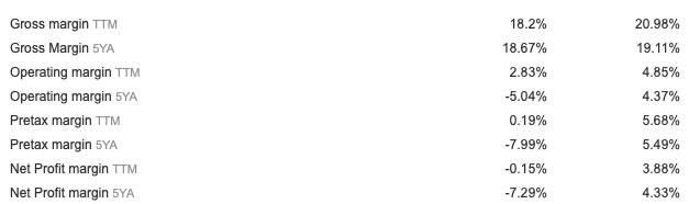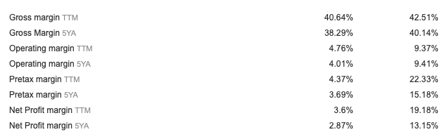 ซึ่งถ้าเทียบกับหุ้นเทคให้บริการค้าขายออนไลน์เป็นหลักอย่าง Amazon ที่มี Gross Margin (TTM) ที่ 40.64% ก็อาจจะยังดูห่างไกลเสียเหลือเกินและอาจจะยังดูไม่สมเหตุสมผลเท่าไร ถ้าจะเอาไปเปรียบเทียบ