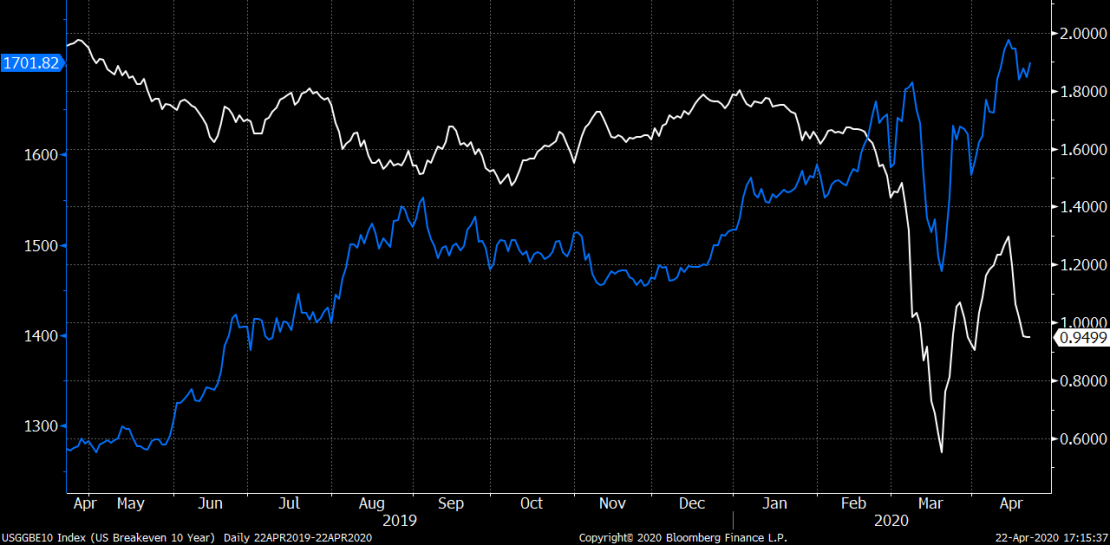 ภาพแสดงความสัมพันธ์ระหว่างความคาดหวังเงินเฟ้อ (10 ปี) กับทองคำช่วงล่าสุด