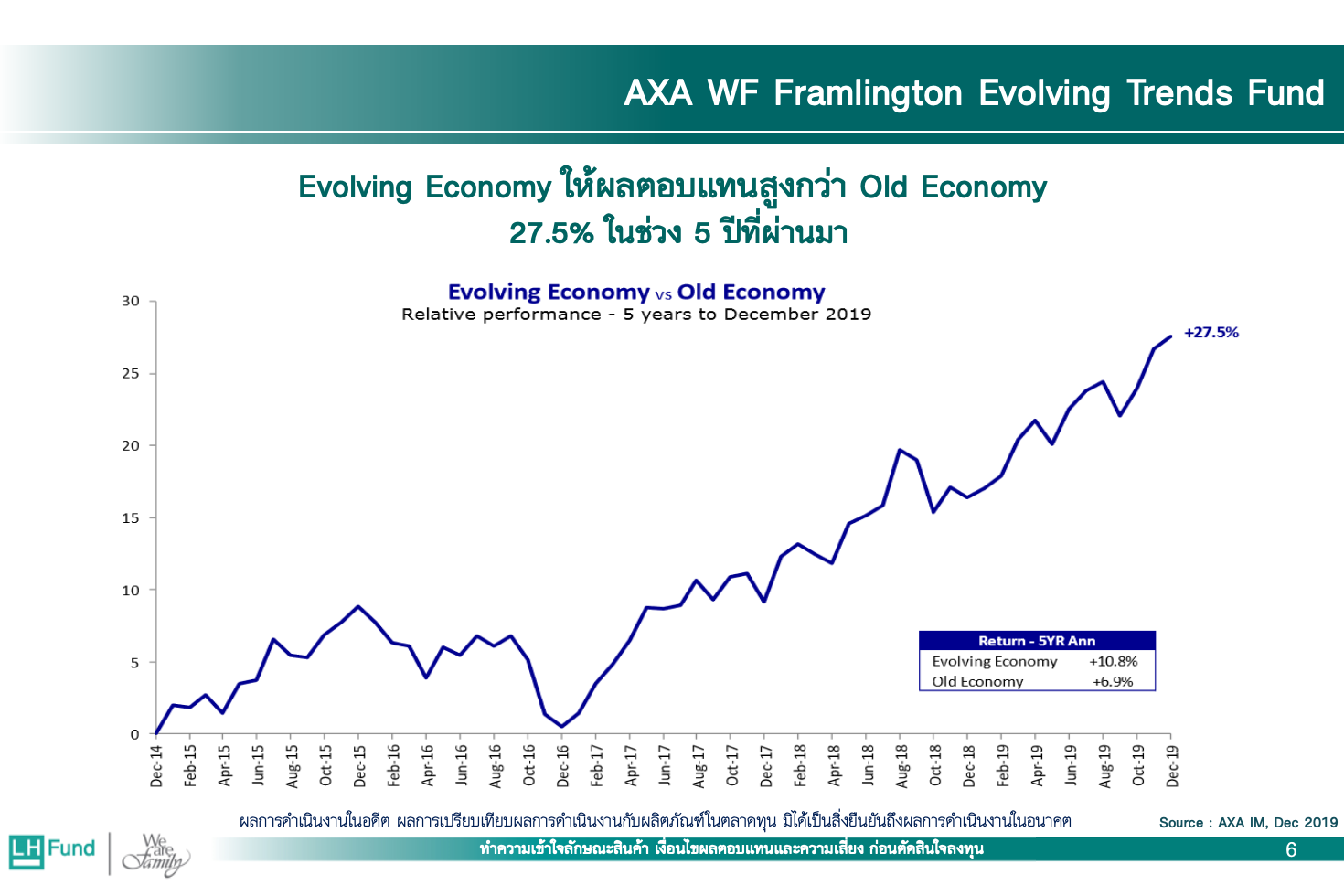 จะเห็นได้ว่าผลตอบแทนของ Evolving Economy มีการเติบโตโดดเด่นกว่ากลุ่มธุรกิจแบบดั้งเดิม โดยให้ผลตอบแทนสูงกว่า กลุ่มเทรนด์เศรษฐกิจแบบดั้งเดิมที่ 27.5%