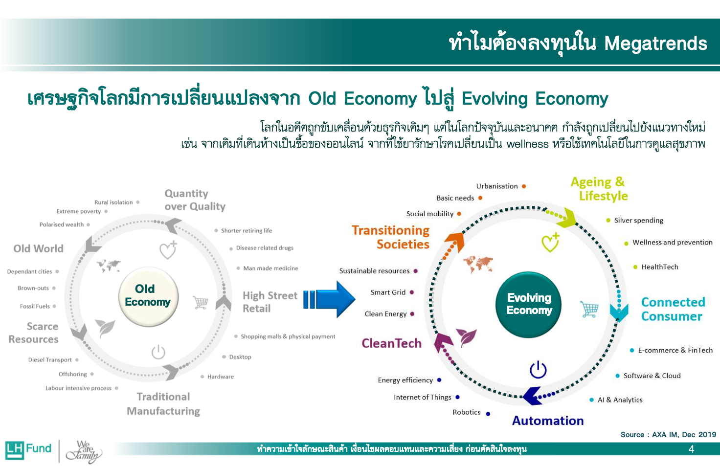 หากพูดถึงการลงทุนใน Evolving Economy หลาย ๆ คนอาจจะสงสัยถึงเบื้องลึกเบื้องหลังว่าเรากำลังจะลงทุนในธุรกิจแบบไหนกันแน่ ในส่วนถัดไปนี้ ผมจะมาขอแจกแจง Theme การลงทุนหลัก ๆ ให้ทุกคนได้รับชมกัน