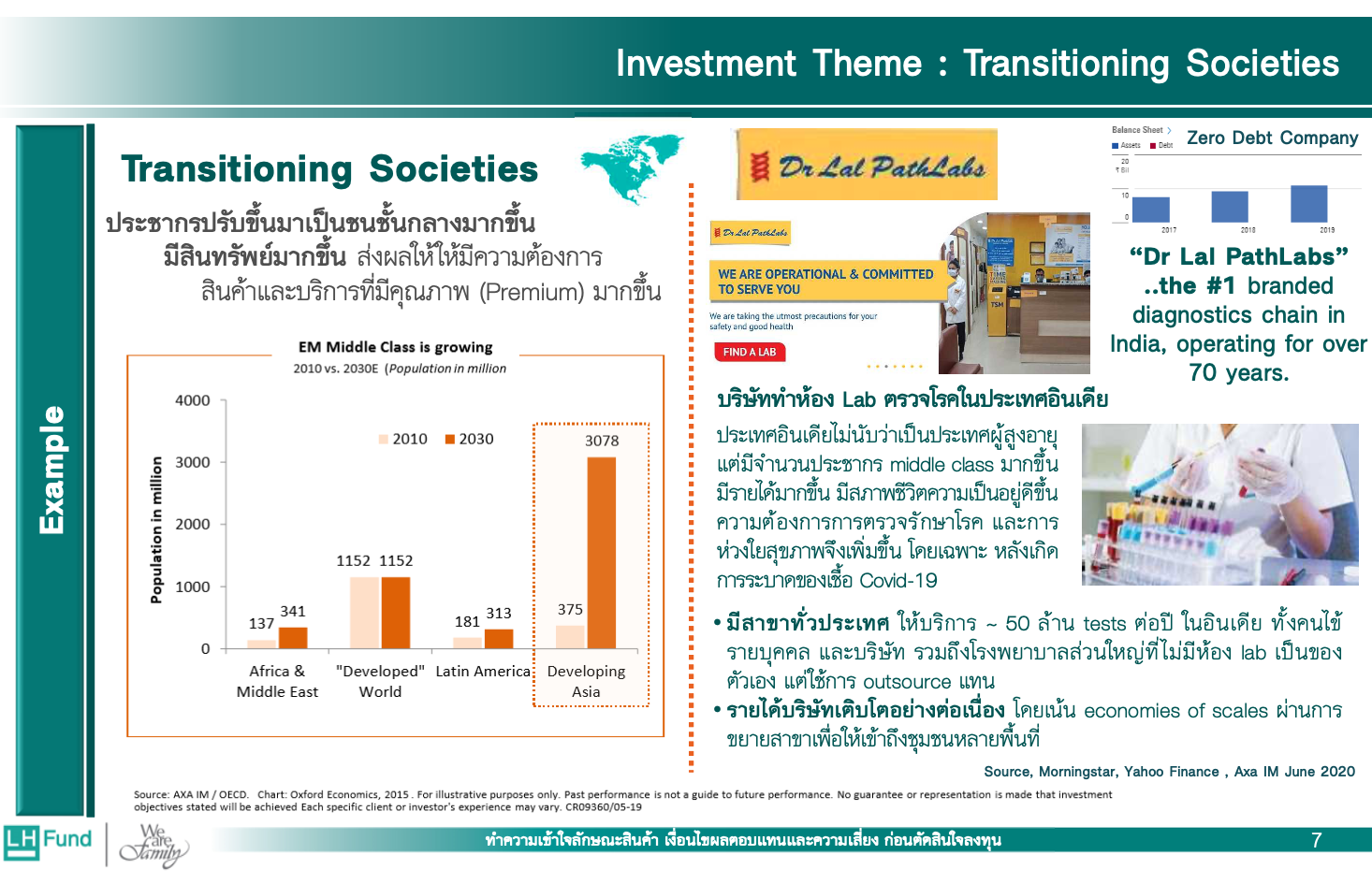 ตัวอย่างเช่น ในประเทศอินเดียประชากรมีการเปลี่ยนผ่านฐานรายได้มากขึ้น มีความเข้าใจและให้ความสำคัญในเรื่องสุขภาพมากขึ้น จึงต้องการความเป็นอยู่ที่ดีมากขึ้น ตัวอย่างธุรกิจในกลุ่มนี้คือ Dr Lal PathLabs บริษัทให้บริการห้อง Lab ตรวจโรค ที่ให้บริการถึง 50 ล้านTests ต่อปี