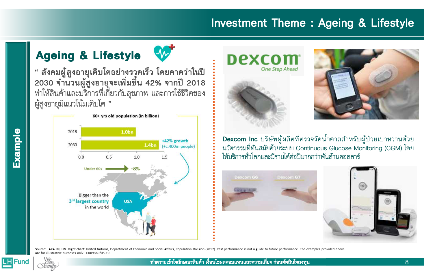 จากปี 2018 ถึงปี 2030 จะมีประชากรที่มีอายุมากกว่า 60 ปีเพิ่มขึ้นถึง 400 ล้านคนหรือ 42%ซึ่งพอ ๆ กับคนอเมริกันทั้งประเทศ ซึ่งการเพิ่มขึ้นของคนกลุ่มนี้มีผลต่อการเจริญเติบโตและการพัฒนาสินค้าและบริการเกี่ยวกับสุขภาพ ตัวอย่างเช่น บริษัท Dexcom Inc ที่ผลิตเครื่องวัดระดับนํ้าตาลผู้ป่วยเบาหวานผ่านผิวสัมผัส โดยไม่ต้องเจาะนิ้วให้เจ็บตัว และเชื่อมต่อข้อมูลผ่าน Bluetooth หรือ Wifi