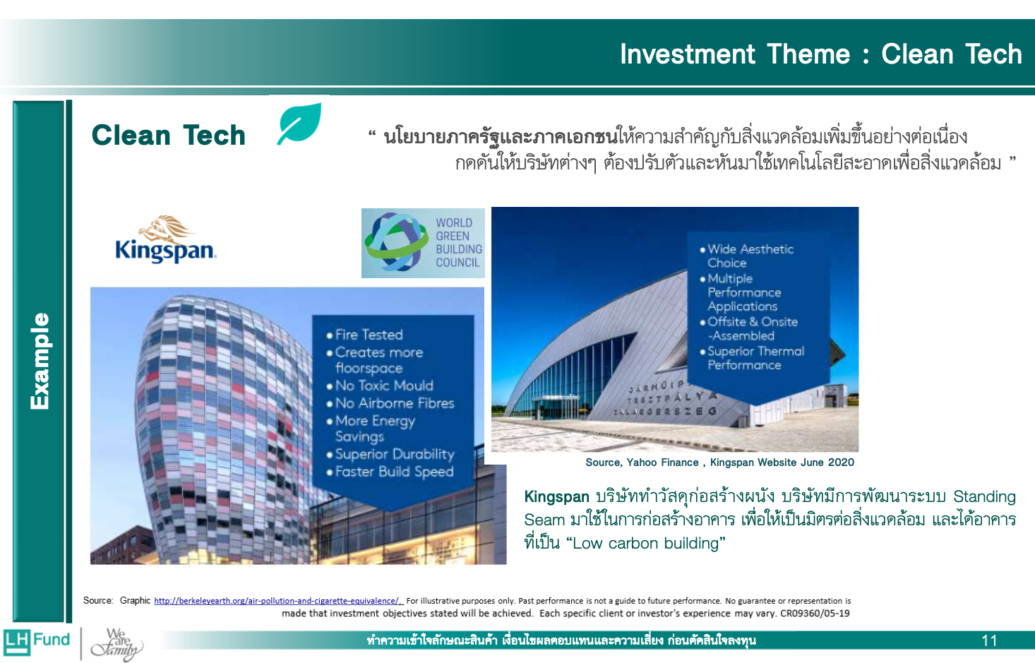 ตัวอย่างเช่น Kingspan บริษัทก่อสร้างและผลิตวัสดุก่อสร้างที่ช่วยลดพลังงานและลดความร้อนภายในตึก และช่วยลดการปล่อยคาร์บอนไดออกไซด์