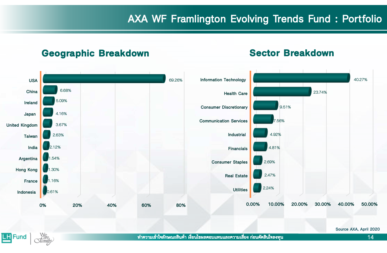 สัดส่วนการลงทุนของกองทุน AXA WF Framlington Evolving Fund อยู่ในอเมริกาและเน้นลงทุน Sector เทคโนโลยีเป็นหลักซึ่งสัดส่วนอาจปรับเปลี่ยนได้ตามสถานการณ์ โดยบริษัทที่ลงทุนล่าสุดเป็นบริษัทชื่อคุ้นหูอย่างเช่น Alphabet (Google) และ Alibaba