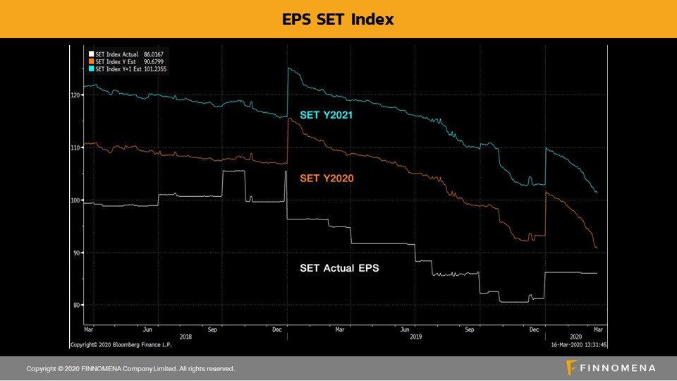 มีการปรับตัวลงต่อเนื่องในส่วน EPS โดยช่วงล่าสุดได้ปรับตัวเป็นขั้นบันไดไหลลงมาแสดงถึงภาวะที่ยํ่าแย่เรียบร้อยแล้ว