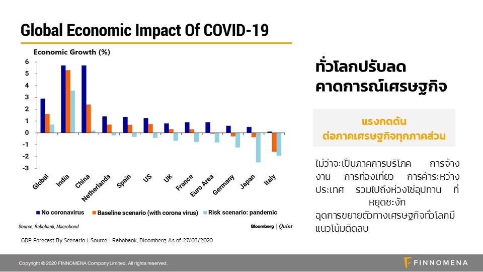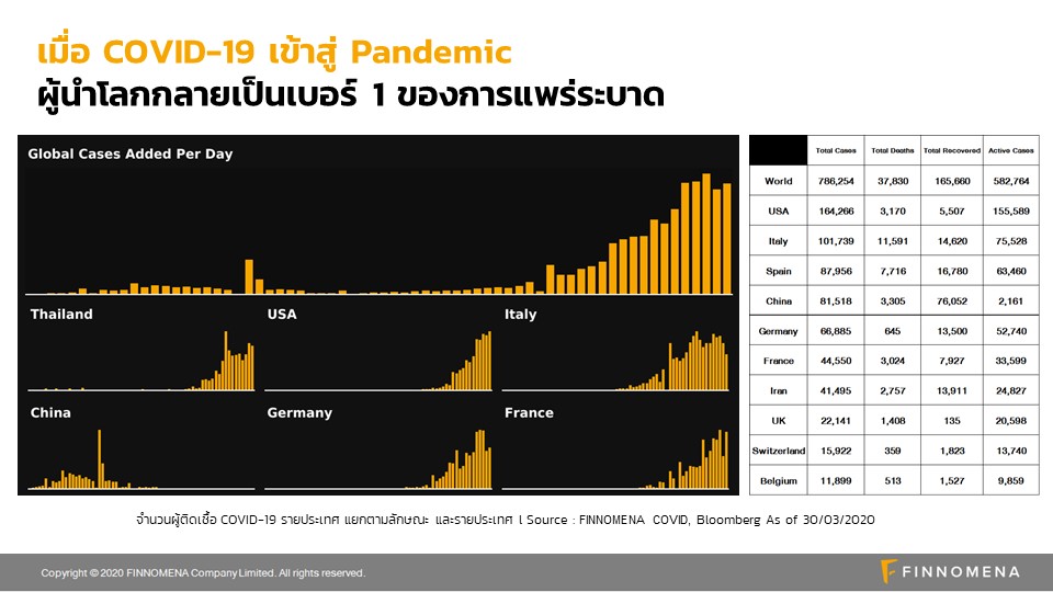 จำนวนผู้ติดเชื้อทั่วโลกยังสูงขึ้น ถึงแม้ความรวดเร็วในการแพร่ระบาดจะลดลง แต่จำนวนยังเยอะอยู่ โดยอาจต้องรอแนวโน้มการติดเชื้อเปลี่ยนเป็นทรงระฆังควํ่า (เป็น slope ไหลลงเรื่อยๆ) ถึงเป็นสัญญาณเชิงบวกให้เราเข้าลงทุนได้อีกครั้ง
