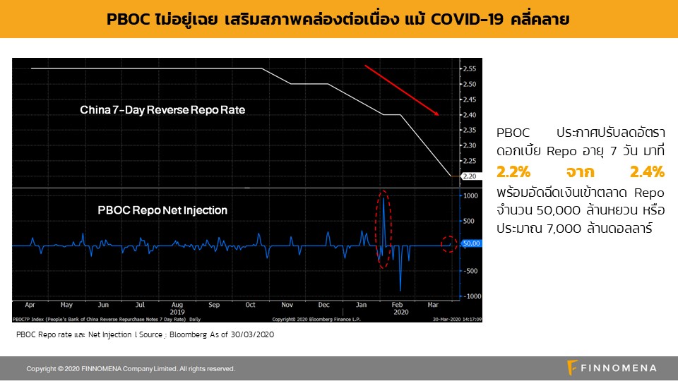 หลังจากที่ทางจีนควบคุมการแพร่ระบาดของไวรัสโควิด-19 ได้เรียบร้อยแล้ว ดูเหมือนทางจีนจะเริ่มออกมาตรการกระตุ้นออกมากับเค้าบ้าง โดยที่ผ่านมามีการลดอัตราดอกเบี้ย REPO จาก 2.4% ลงมา 2.2% และอัดฉีดเงินเข้าตลาด REPO 50,000 ล้านหยวน ซึ่งจะช่วยเพิ่มสภาพคล่องให้กับตลาดเงินและธนาคารพาณิชย์ต่างๆให้มีเงินหมุนได้คล่องมือขึ้น