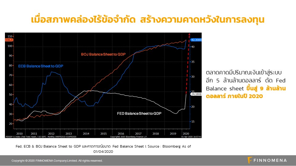 จุดนี้ผมมองว่าค่อนข้างน่าสนใจเลยทีเดียวครับทางแบงก์ชาติญี่ปุ่น (BOJ) มีหนี้เกือบๆ 100% ต่อ GDP อาจจะค่อนข้างตึงตัวเลยทีเดียว แต่ที่น่าสนใจคือทาง Fed ครับซึ่งที่ผ่านมามีการปรับ Balance sheet แบบสุดโต่ง โดยอาจดันจำนวนหนี้เพิ่มขึ้นประมาณเกือบๆ 50% ของ GDP ได้เลยทีเดียว