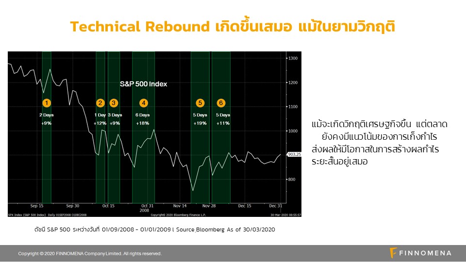 ตากภาพจะสังเกตได้ว่าช่วงขาลงในวิกฤติปี 2008 มี 4 ครั้งที่ตลาดกลับมาดีดตัวได้ในช่วงขาลงโดยใช้เวลาคร่าวๆแค่ 6 วันทำการ โดยเราอาจสรุปได้ว่าการที่ตลาดดีดตัวขึ้นมาในช่วงนี้ อาจเป็นแค่ความสุขชั่วคราว (หลอกให้เราดีใจและจากไป) เพราะฉะนั้นในช่วงนี้ที่ตลาดกลับมาบวกได้ 10-20% ถือเป็นเรื่องปกติ เพราะ เป็นการพักเก็บแรงของหมีในตลาดนั่นเอง
