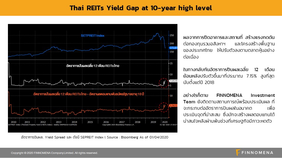 ตอนนี้ yield ตัว property fund อยู่ราวๆที่ 7% แล้ว แต่ยังมีแรงกดดันระยะสั้นจากสถานการณ์โควิด อาธิเช่น ตัวเลขนักท่องเที่ยวที่ลดลง และอาจส่งผลกระทบต่อธุรกิจการบิน ห้างสรรพสินค้าที่ต้องหยุดทำการ จำนวนผู้พักในโรงแรมที่ โดย ณ ตอนนี้ราคาได้ลงมาประมาณ 30% เรียบร้อยแล้ว โดยหากเศรษฐกิจเริ่มฟื้นตัวคนอาจจะเริ่มเข้ามาลงทุน ดังนั้นการมี property fund ในพอร์ตถือว่าพอใช้ได้ในช่วงนี้