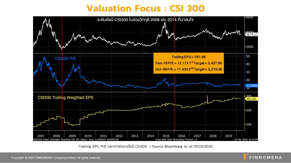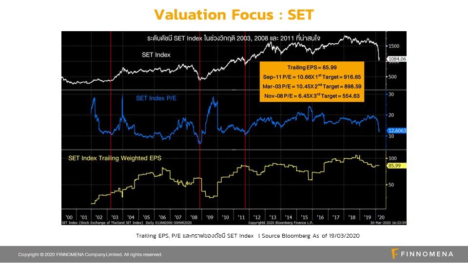 เป้าราคาที่ได้เกิดจากการเทียบระดับ P/E ที่ตํ่าสุดของแต่ละวิกฤติ โดยเป้าแรกจะอยู่ที่วิกฤติปี 2011 ราวๆ 900 จุด และตํ่าสุดที่ราวๆ 500 จุด