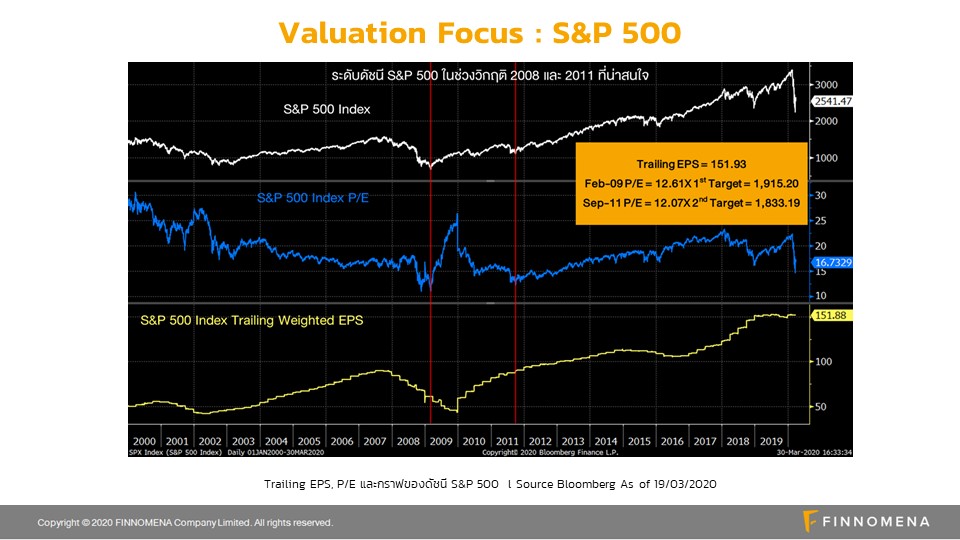 2) เป้าราคาและค่า P/E ลดลงมาใกล้ช่วงวิกฤติครั้งก่อนๆ โดยประมาณการเป้าราคาของ S&P 500 ไว้ที่ราวๆ 1,800 จุด ทาง SET ที่ 500 จุดตํ่าสุด โดยระดับแรกที่ 900 จุด ระยะกลางๆที่ 700 จุด