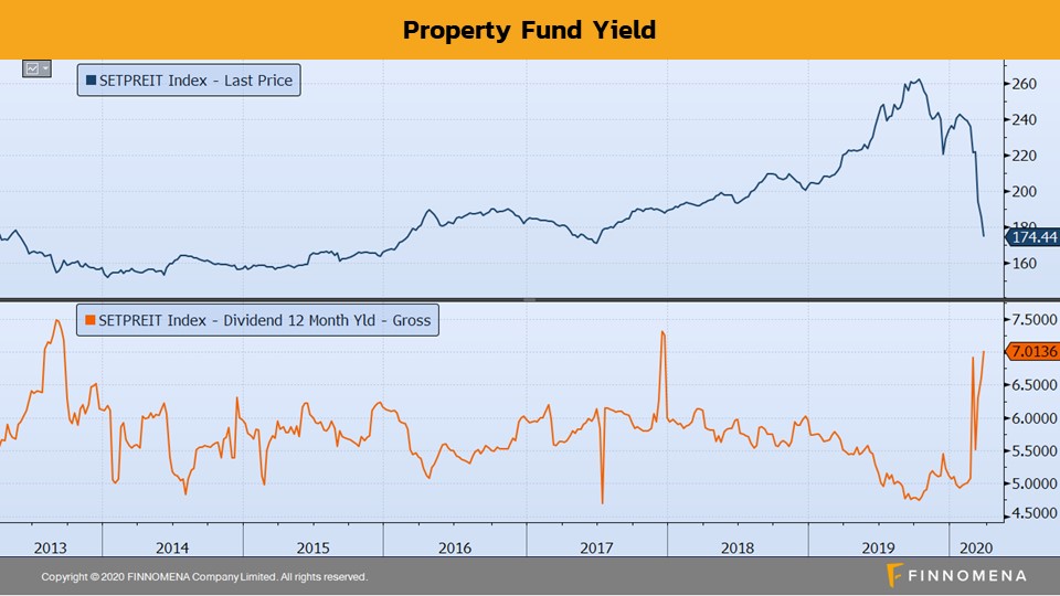 จากภาพจะเห็นได้ว่ามีการเทขายอย่างต่อเนื่องสังเกตได้จาก yield ที่เพิ่มขึ้น โดยในจุดนี้ถือว่าพอทยอยสะสมได้หากต้องการลงทุนยาวๆ โดยปัจจุบันตัว yield นั้นอยู่ใกล้ๆกับช่วงปี 2008 ในเชิงพื้นฐานนั้นอสังหาริมทรัพย์ในส่วนของคลังสินค้า ออฟฟิศให้เช่าจริงๆอาจไม่ได้รับผลกระทบ ยกเว้นตัวของห้างสรรพสินค้า การเทขายในรอบนี้จึงอาจเป็นเพียง การขายอย่างตื่นตระหนก (panic sell) ของตลาด