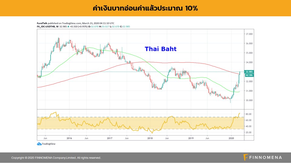 การอ่อนตัวของค่าเงินบาท อาจสอดคล้องกับการที่ต่างชาติเทขาย หุ้นและตราสารหนี้ในไทย โดยอาจไปได้ถึงที่ราคาราวๆ 33.1-33.2 บาท/ดอลลาร์ ซึ่งอาจจะประจวบเหมาะกับช่วงที่ SET Index เกิดการ rebound ใน wave b พอดี