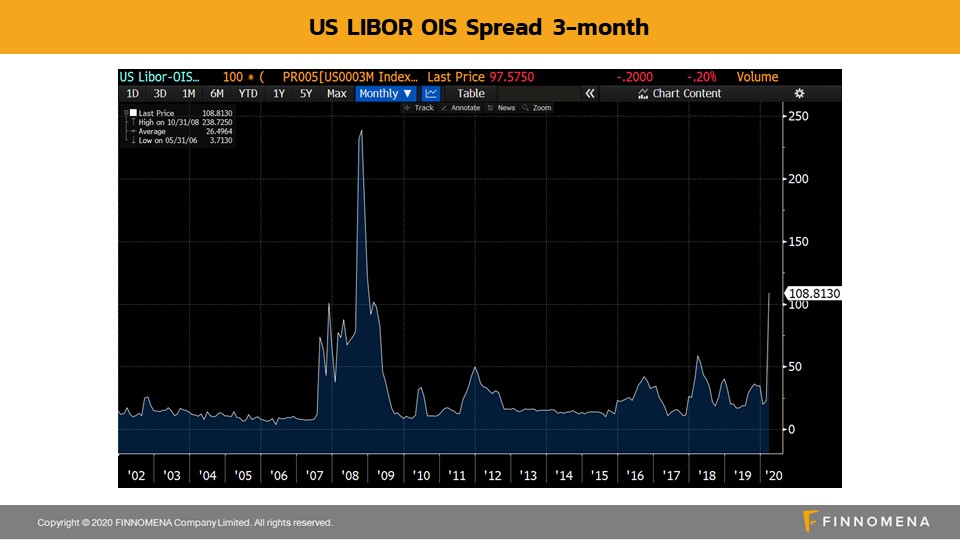 ดังนั้นถ้า OIS เพิ่มขึ้นมากๆแสดงถึงว่าตลาดเงินมีความตรึงตัวในระยะสั้น เพราะ แสดงให้เห็นถึงการที่ผู้ปล่อยกู้อาจกังวลกับการชำระหนี้ของลูกหนี้ ในช่วง 2 วัน ของสัปดาห์ที่ผ่านมา ปรับขึ้นถึงเกือบๆ 1% ซึ่งหากส่วนต่างนี้เพิ่มมากขึ้นก็แสดงถึงความเสี่ยงที่มากขึ้น ซึ่งหากเทียบกับช่วง Lehman Brothers ในช่วงวิกฤติ subprime ตอนแรกตัว spread นั้นอยู่ที่ราวๆ 100 ก่อนจะปรับไปถึง 200 ในช่วงจุดสูงสุดของวิกฤติ ดังนั้นนี่จึงอาจเป็นเหตุผลที่ Fed ทำ QE ต่อเนื่อง เพราะ เห็นถึงสัญญาณที่ไม่สู้ดีนักในจุดนี้