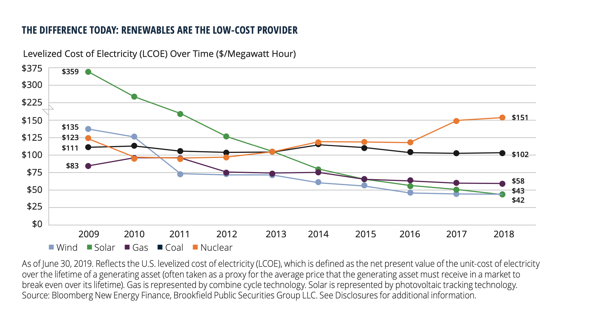 แต่ในที่นี้พลังงานลมและแสงอาทิตย์อาจมาเหนือกว่าการผลิตพลังงานในรูปแบบเดิม ๆ สังเกตได้จากข้อมูลด้านล่างที่การผลิตไฟฟ้าจากพลังงานลมและแสงอาทิตย์ล้วนใช้ต้นทุนที่ต่ำลงมาอย่างต่อเนื่อง ถือได้ว่าเป็นพลังงานแห่งอนาคตที่ภาคธุรกิจอาจนำมาปรับใช้อย่างแท้จริง