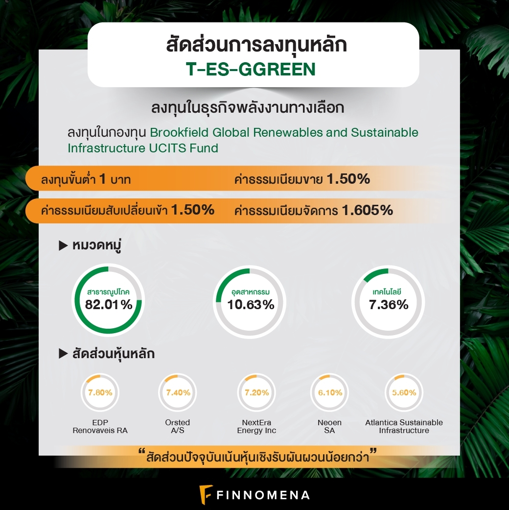 นโยบายการลงทุนของ T-ES-GGREEN นั้นจะเน้นสร้างผลตอบแทนให้ใกล้เคียงกองทุนต่างประเทศเป็นหลักซึ่งก็คือกองทุน Brookfield Global Renewables and Sustainable Infrastructure UCITS Fund เป็นหลัก ซึ่งกองทุนที่ว่ามีจุดมุ่งหมาย คือ การสร้างการเติบโตของเงินทุนไปพร้อม ๆ กับเน้นสร้างกระแสเงินสด