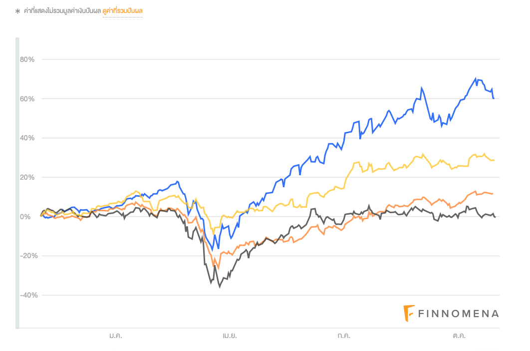 ภาพแสดงผลตอบแทนกองทุนในภูมิภาคต่าง ๆ กองทุนหุ้นอเมริกา (เส้นสีฟ้า), กองทุนหุ้นจีน (เส้นสีเหลือง), กองทุนหุ้นเอเชีย (เส้นสีส้ม), และกองทุนหุ้นไทย (เส้นสีเทา)