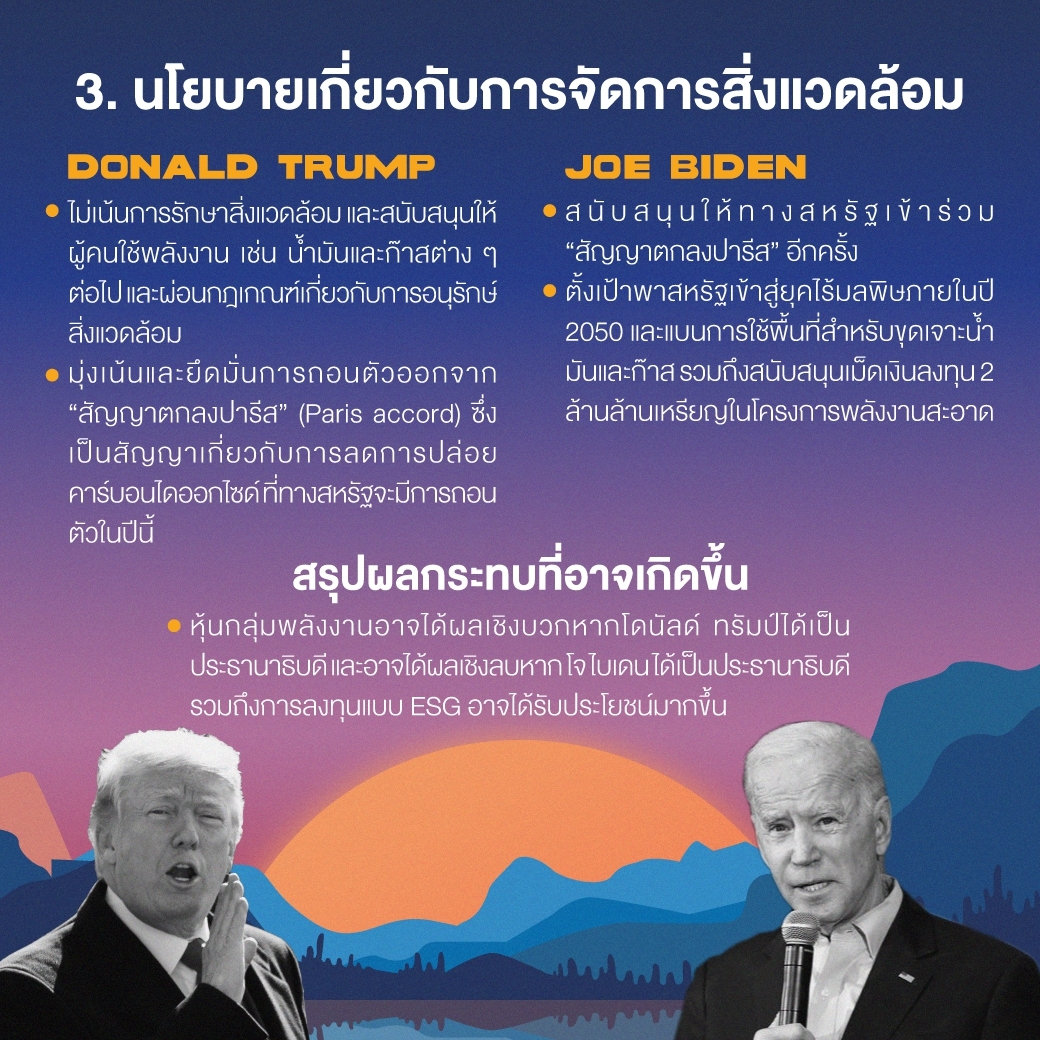 - พวกหุ้นกลุ่มพลังงานอาจได้ผลเชิงบวกหากโดนัลด์ ทรัมป์ได้เป็นประธานาธิบดี และอาจได้ผลเชิงลบหาก โจ ไบเดน ได้เป็นประธานาธิบดี