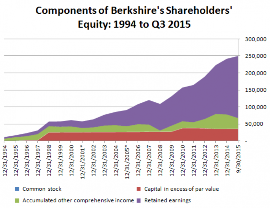 ภาพแสดงการเติบโตของหุ้น เบิร์กเชียร์ ฮาธาเวย์ พื้นที่สีม่วงคือ การพอกพูนของกำไรสะสม หรือ Retained earning ตั้งแต่ปี 1994 – 2015 จะพบว่ากำไรสะสมเติบโตรวดเร็ว และสร้างความมั่งคั่งให้กับ บัฟเฟตต์ และผู้ถือหุ้น เบิร์กเชียร์ ฮาธาเวย์ หลายเท่าตัว