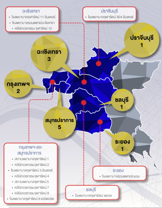 ปัจจุบัน CHG มีจำนวนสาขาโรงพยาบาลกว่า 13 แห่ง กระจายกันอยู่ที่จังหวัดกรุงเทพฯ สมุทรปราการ ระยอง ชลบุรี ฉะเชิงเทรา และปราจีนบุรี เรียกได้ว่า ครอบคลุมในส่วนพื้นที่ที่เขาถนัด นั่นคือ ในเขตเมืองอุตสาหกรรมต่าง ๆ ในประเทศไทย