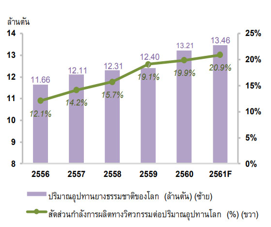 เมื่อเรามาดูตัวเลขที่รายงานใน MD&A ของหุ้น STA จะพบว่า ปริมาณอุปทานยางธรรมชาติของโลกที่เป็นแท่งสีม่วงยังคงเติบโตสูง คิดเป็นสัดส่วนกำลังการผลิตของยางพาราที่แสดงดังเส้นสีเขียวโตกว่า 20.9% ในปีล่าสุด สัดส่วนความต้องการยางพาราในโลกดูเหมือนจะเริ่มมากขึ้น