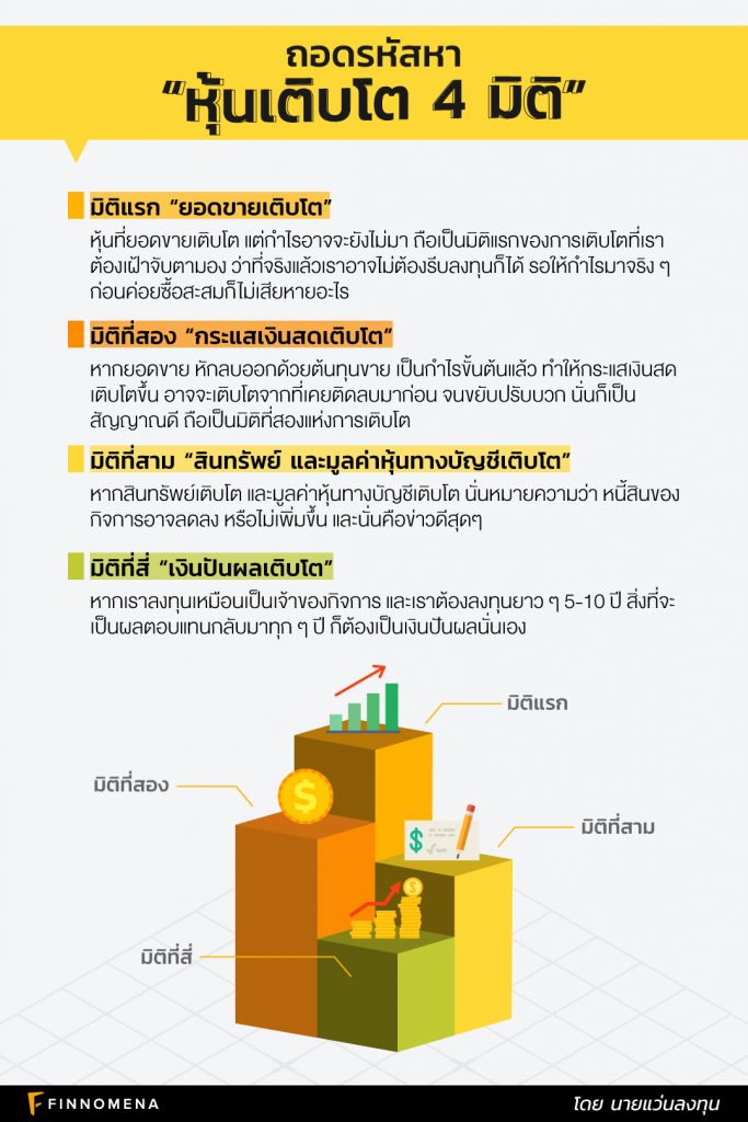 “หุ้นสี่มิติ” หมายถึง การเติบโตในทุก ๆ ด้านที่เป็นเรื่องดี ได้แก่ การเติบโตของยอดขาย การเติบโตของกระแสเงินสด การเติบโตของสินทรัพย์ และมูลค่าทางบัญชี สุดท้ายก็คือ การเติบโตของเงินปันผล