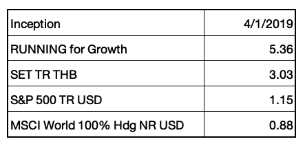 ถ้ามา RUN ผลตอบแทนเป็นกราฟเปรียบเทียบกัน จะเห็นว่าพอร์ต RUNNING For Growth ที่เป็นเส้นสีน้ำเงิน ทำผลตอบแทนได้ “โดดเด่น” และผมเชื่อว่า ผลตอบแทนจะยังคงทำได้ดีติดต่อต่อเนื่องไปอีกหลายระยะ