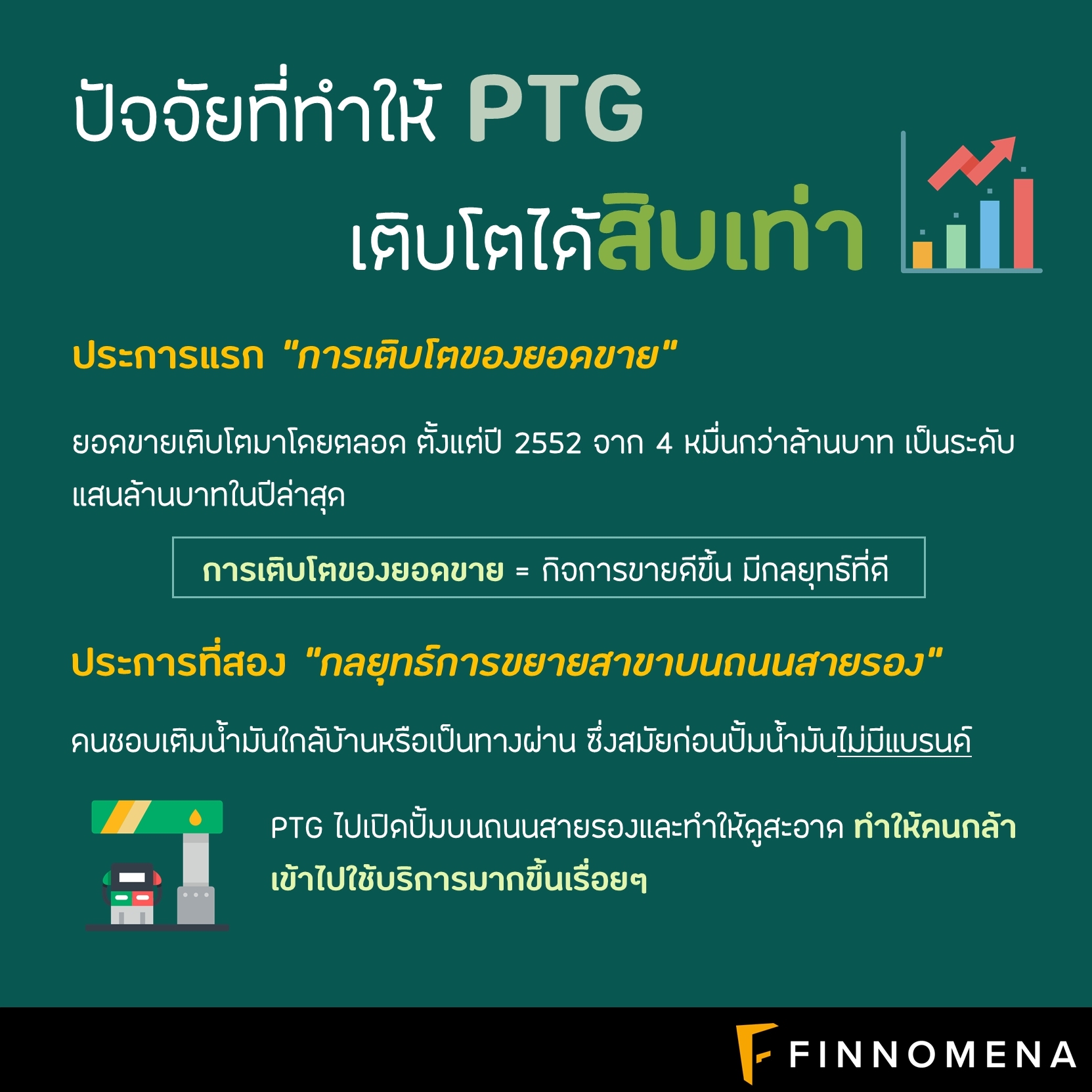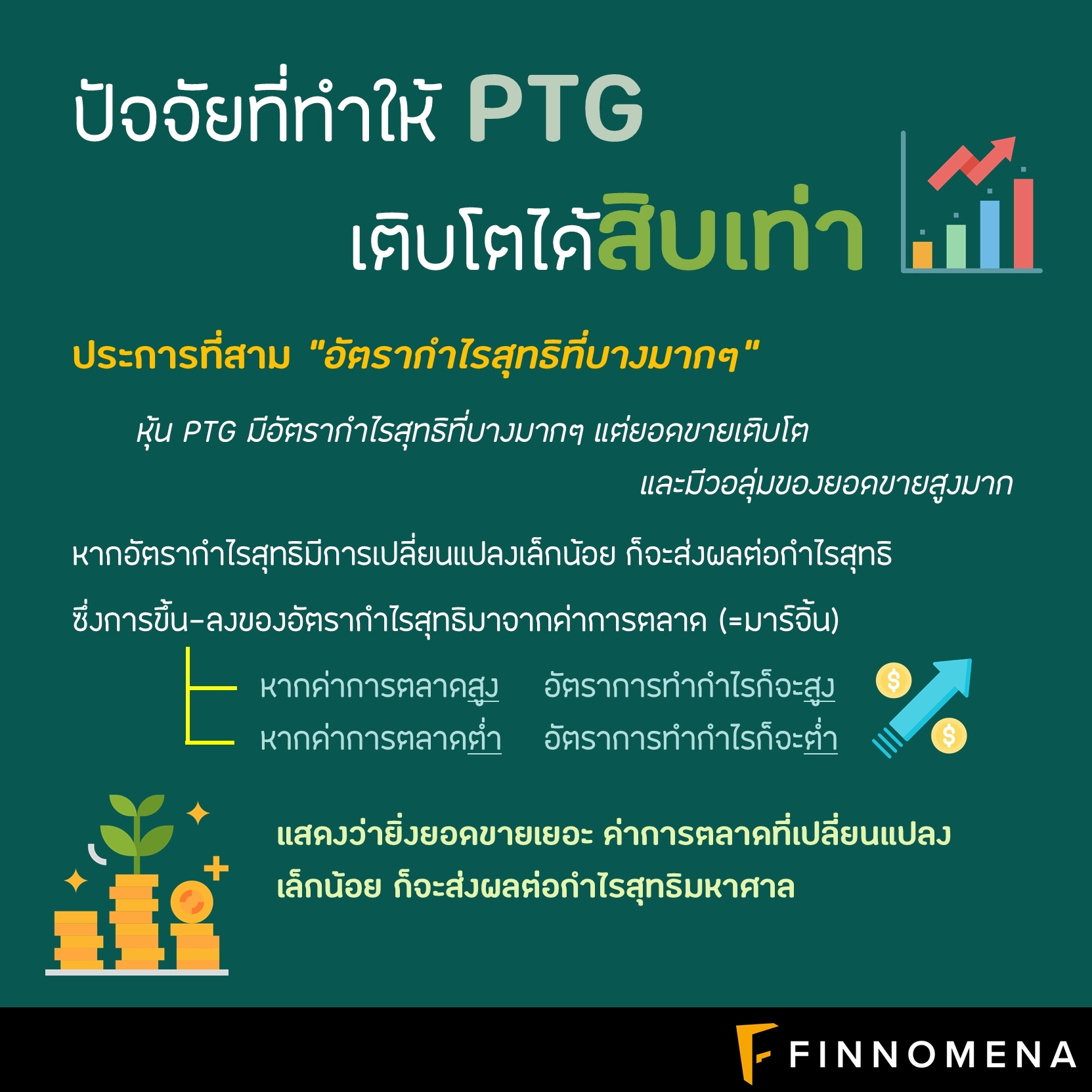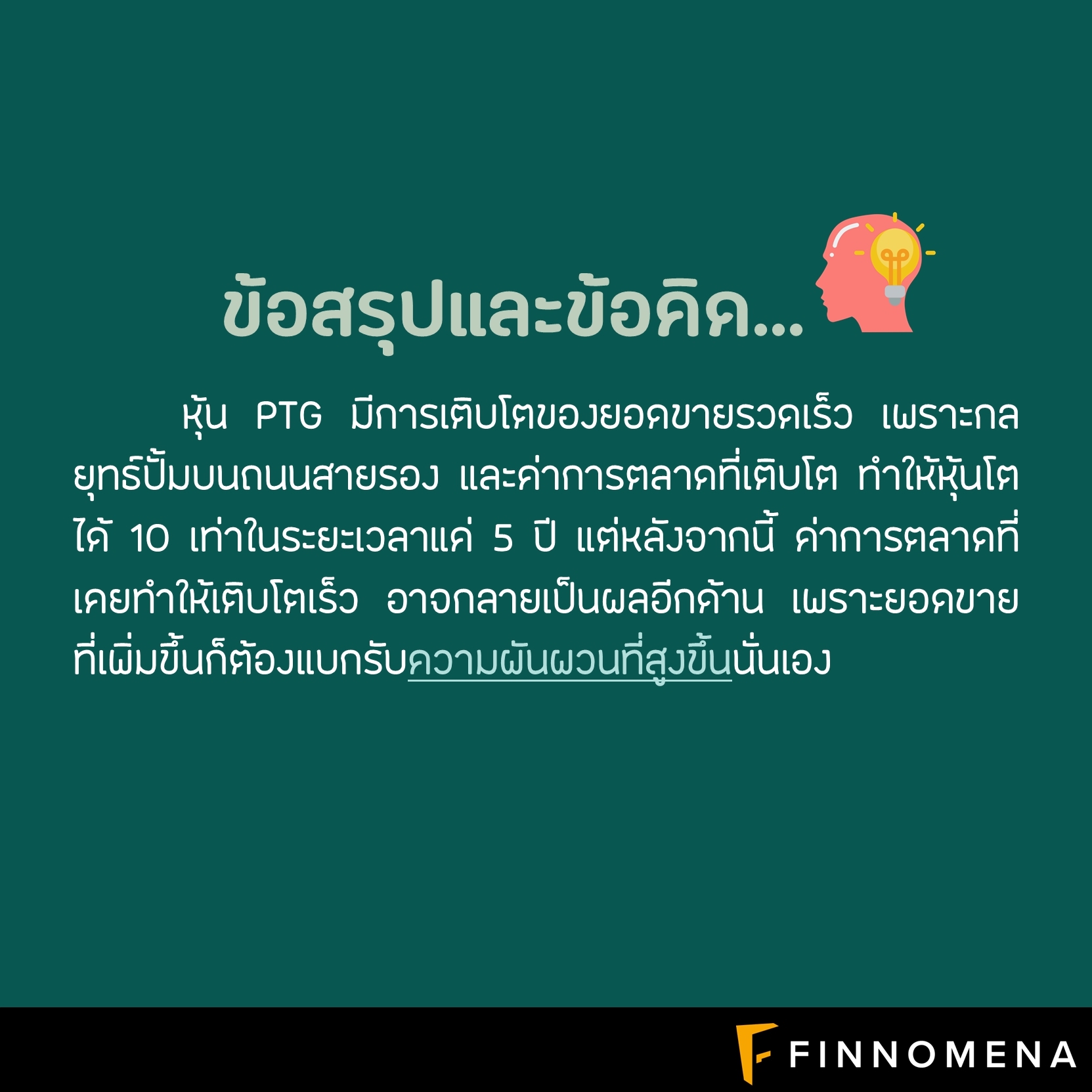 หุ้น PTG ในห้วงปีที่ผ่านมามีการเติบโตของยอดขายรวดเร็วมาก ด้วยกลยุทธ์ปั้มบนถนนสายรอง และค่าการตลาดที่เติบโตในช่วงที่ผ่านมาทำให้หุ้นโตได้ 10 เท่าในระยะเวลาแค่ 5 ปี แต่หลังจากนี้ไป ค่าการตลาดที่เคยทำให้เติบโตเร็ว อาจกลายเป็นผลอีกด้าน เพราะยอดขายที่เพิ่มขึ้นก็ต้องแบกรับความผันผวนที่สูงขึ้นนั่นเองครับ