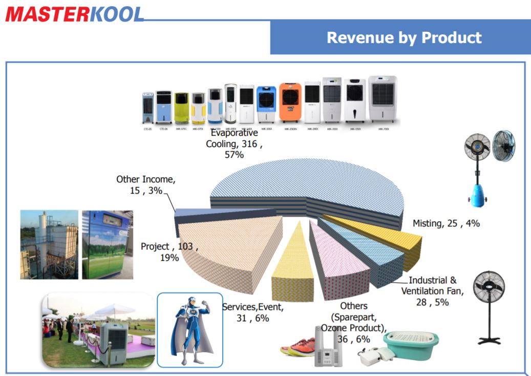 KOOL มียอดขายจากสินค้าไม่กี่ประเภท แต่กลุ่มที่สร้างรายได้เยอะที่สุดคือผลิตภัณฑ์พัดลมไอเย็น ที่มีสัดส่วนรายได้ถึง 57% ของรายได้รวม นอกจากนี้ KOOL ก็ยังมีรายได้จากการทำโปรเจ็กต์ เช่นการไปติดตั้งพัดลมตามสถานที่ต่างๆ